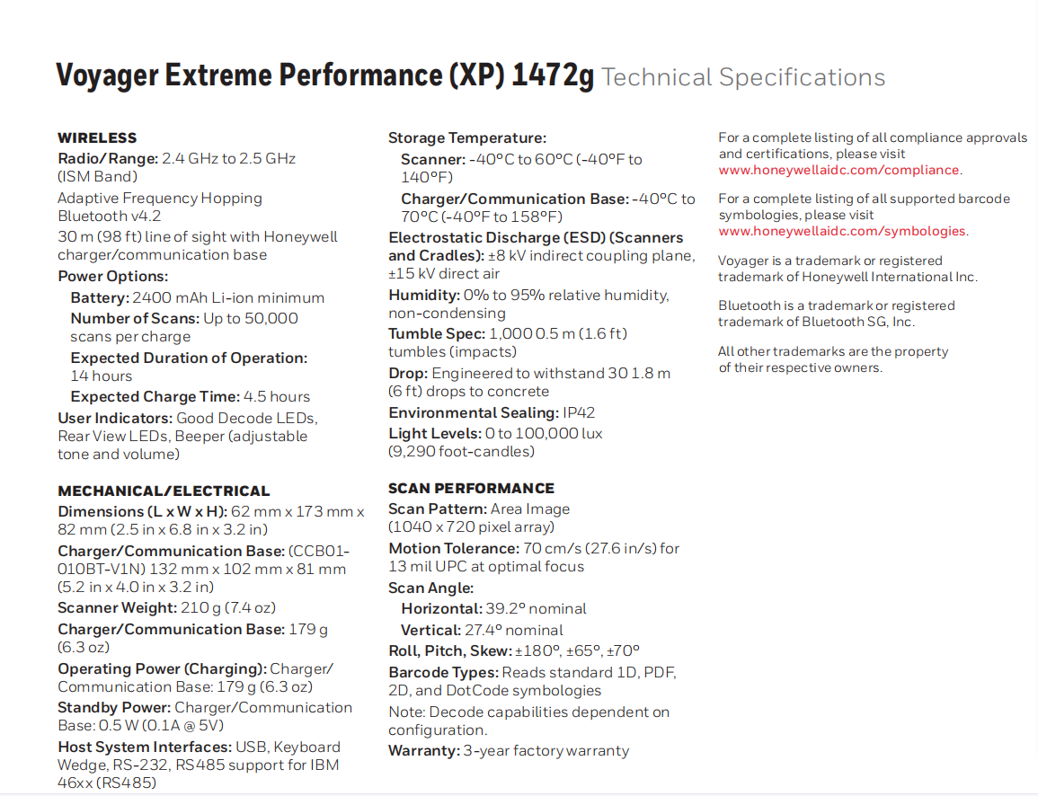 Durable, Highly Accurate 2D Cordless Scanner Designed for in-store retail environments requiring a highly accurate 2D scanning solution in a durable form factor, the Voyager™ Extreme Performance (XP) 1472g cordless scanner delivers industry leading scanning capability on traditional barcodes and digital screens – even on damaged and difficult-to-read codes.
