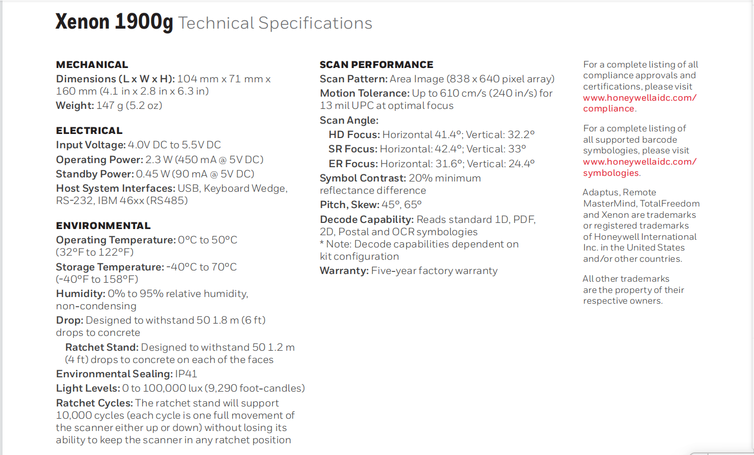 Built with durability in mind, the Xenon 1900g scanner can withstand up to 50 drops to concrete from distances as high as 1.8 meters (6 feet). An IP41-rating provides added protection. With a solid-state design backed by a five-year warranty, the Xenon 1900g scanner is constructed to deliver years of uninterrupted performance.