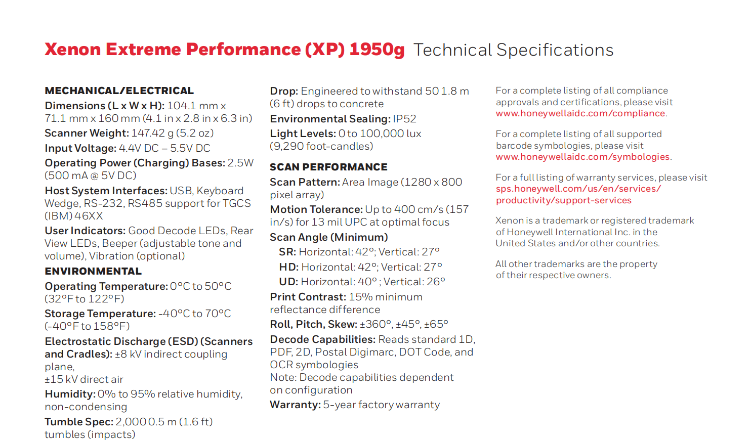 Empower your cashiers to deliver on your mission and commitment to provide excellent customer service experiences with the Honeywell Xenon Extreme Performance (XP) series. The Xenon XP 1950g scanner offers superior scan performance, easily capturing even the most difficult-to-read or damaged barcodes.