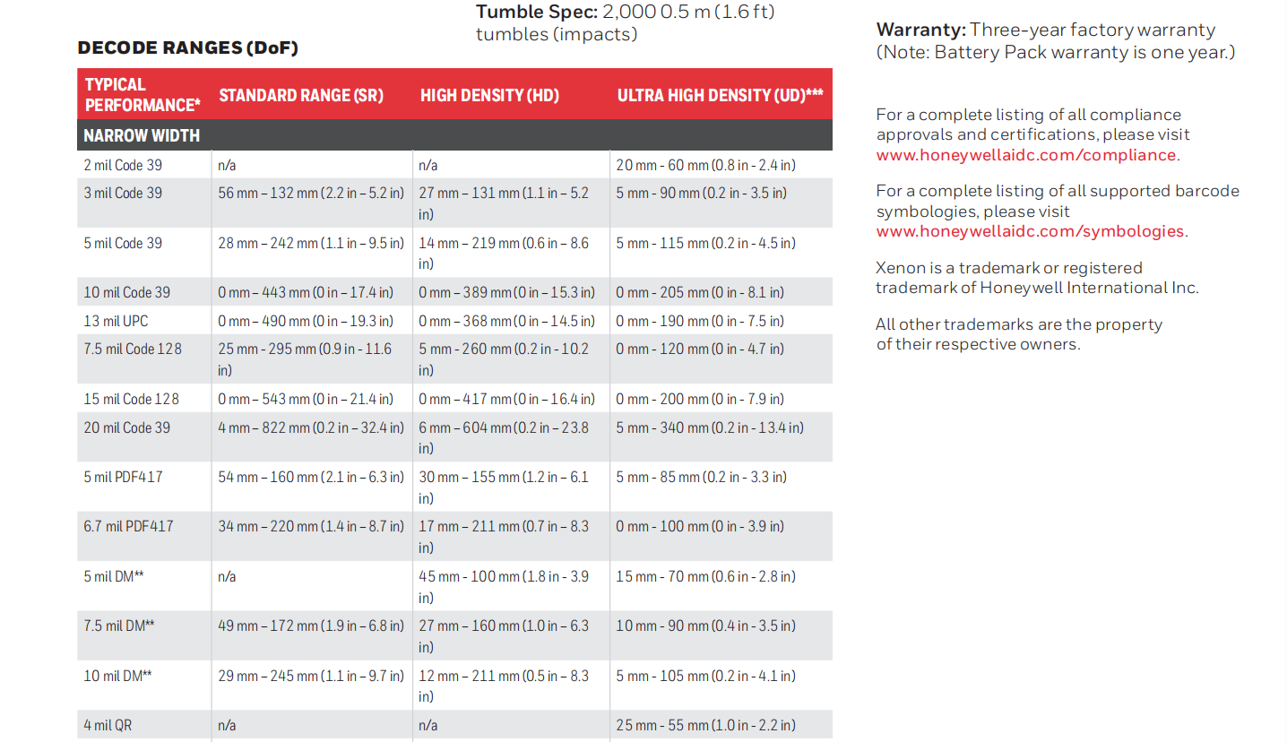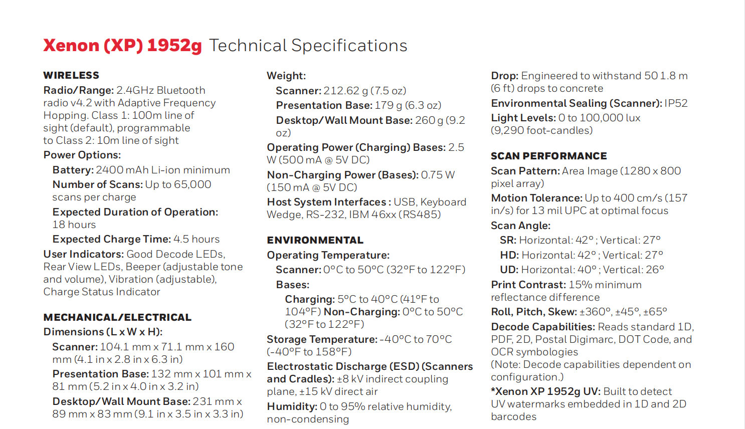 Engineered to 50 drops at 1.8 m (6 ft) and 2,000 tumbles at 0.5 m (1.6 ft), and with an IP52 ingress rating for water and dust, the Xenon XP 1952g scanner delivers class-leading durability. This significantly reduces scanner downtime and service costs, leading to a longer lifecycle and a lower total cost of ownership.