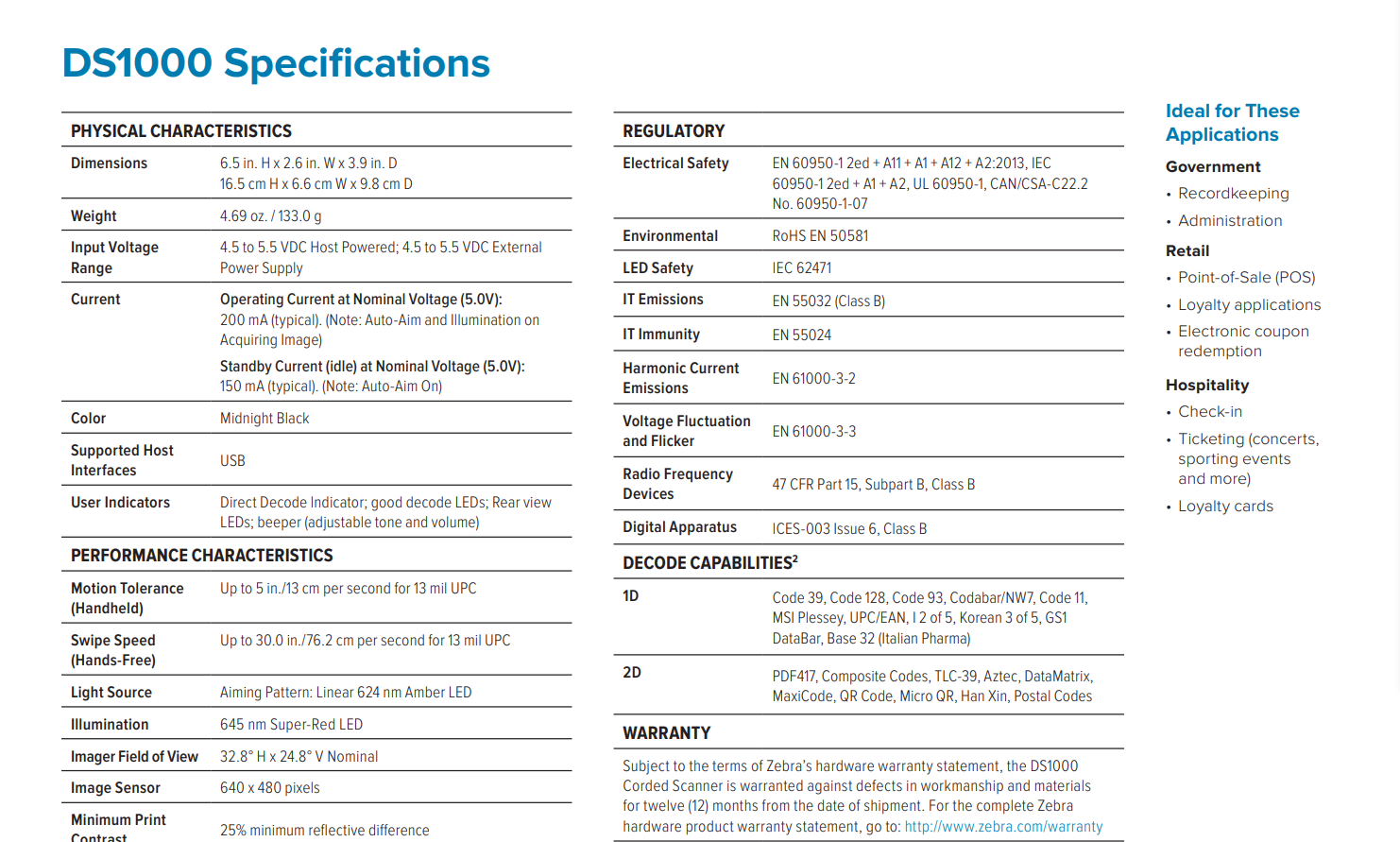 The DS1000 offers practical barcode scanning performance so workers can easily capture your everyday 1D and 2D barcodes.With omni-directional scanning, there is no need to line up the