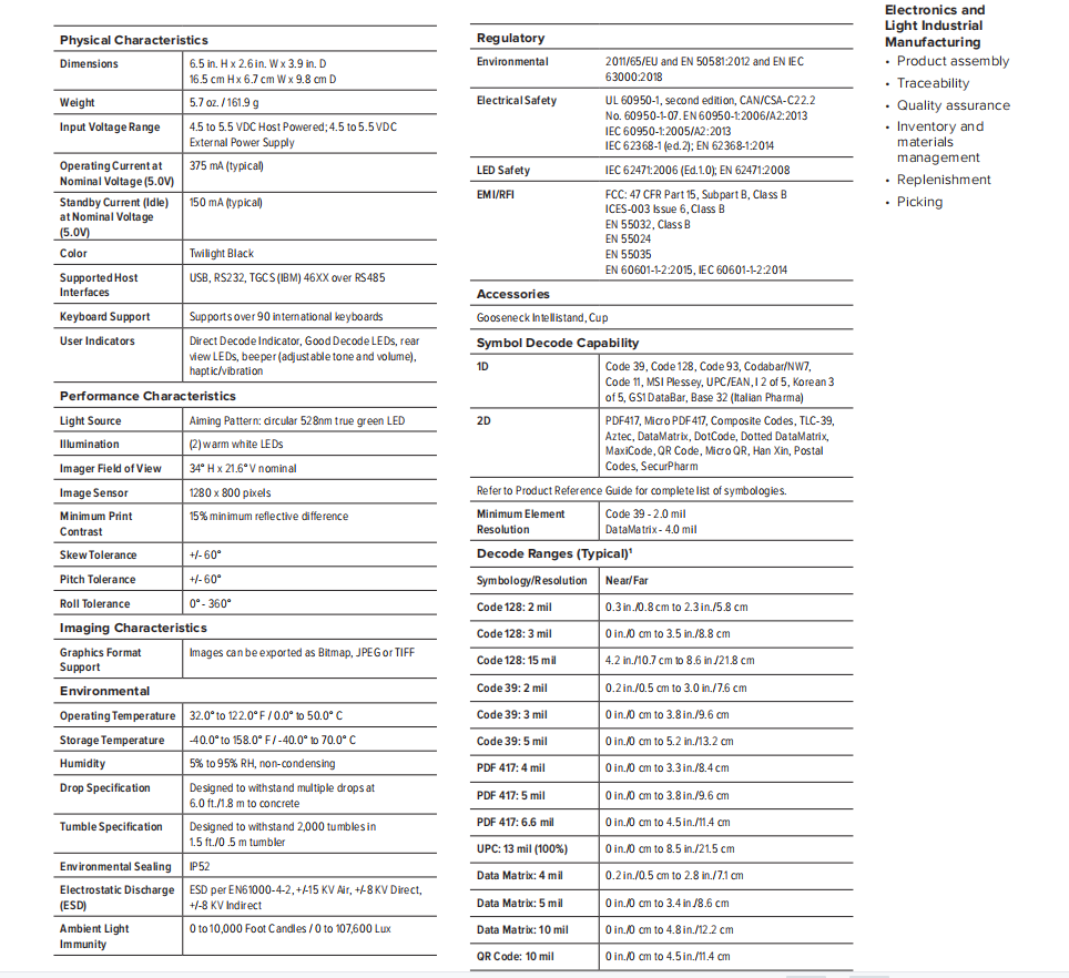 No matter what type of marks and barcodes are found in your manufacturing operations, you can capture them all with theDS4608-DPE. It easily reads the tiny and dense laser etchedDPM codes on plastic and metal subcomponents, as well as ink mark, chemical etch, ink jet mold and thermal spray. And the same imager can read 4-inch wide barcodes found on picklists.carton labels and packages, delivering outstanding value-youc an use the same device for multiple applications throughout your operations