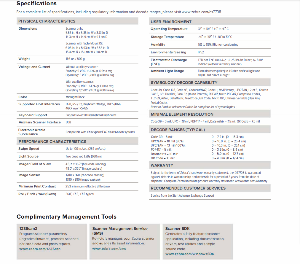 Multiple features make the DS7708 the most durable device in its class. Therecessed scan window prevents marks and scratches that can degrade scanning performance and llfecycle. In addition the electronics are located in the toparea of the DS7708 to prevent damageand protect uptime in the event of a spill.