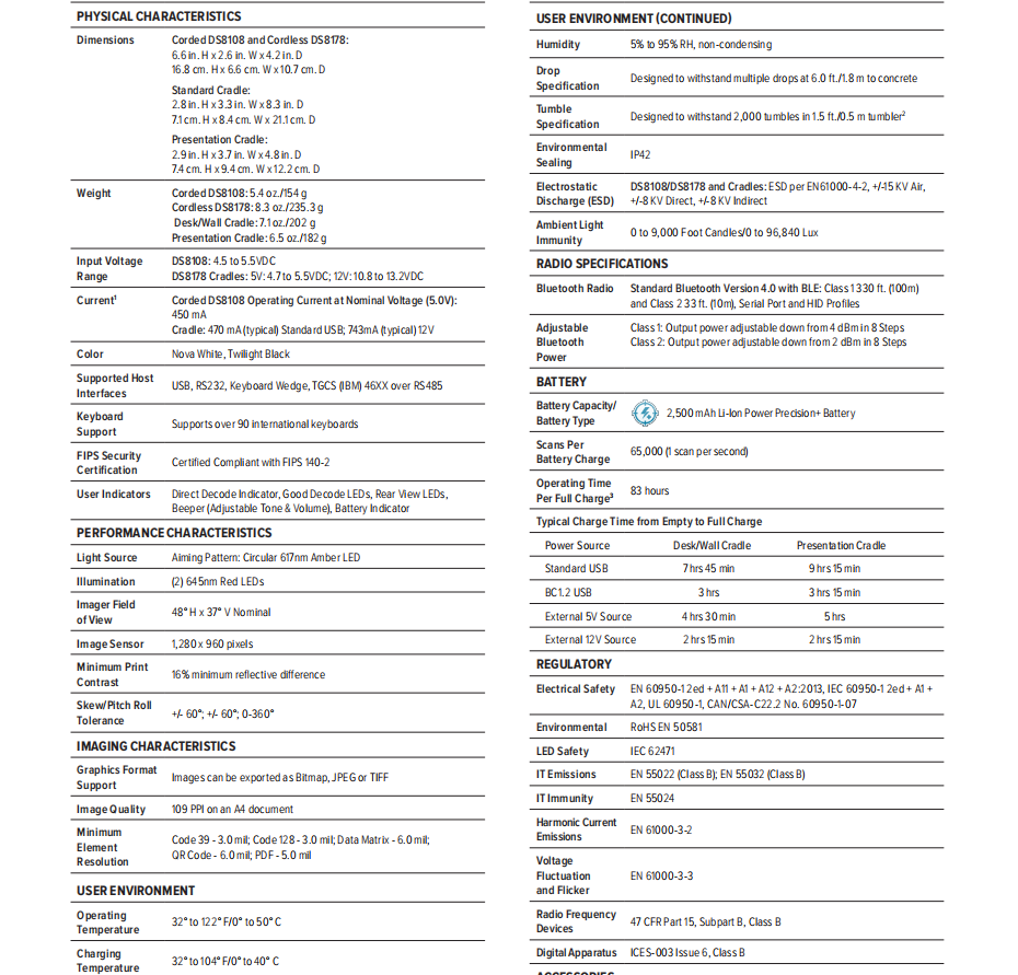 No more guess work on the status of a battery at the startof a shift The DS8178 is the only scanner in its class that makes it easy to see at a glance whether a battery needsto be replaced before the scanner is placed into service.