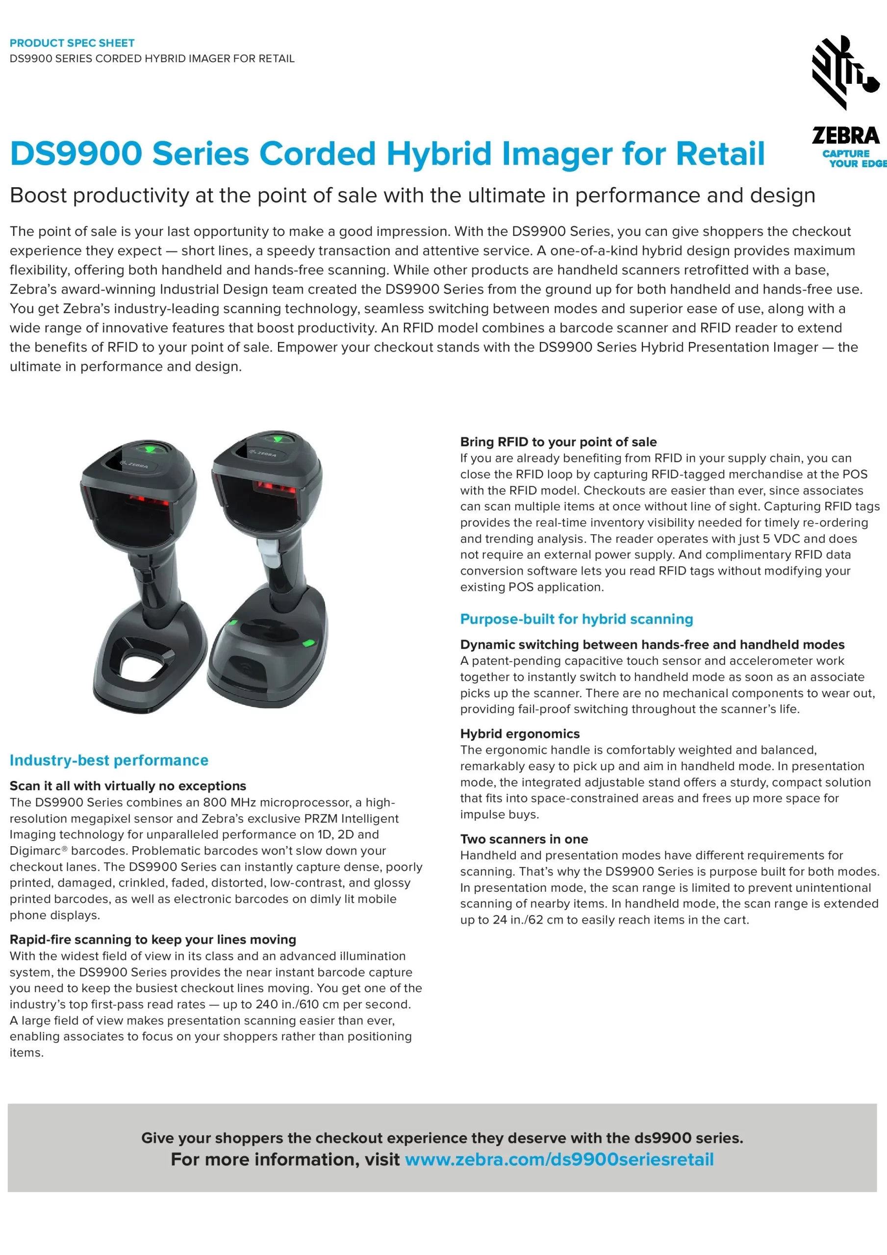 The Zebra DS9900 Series scanners are just the right area imagers when it comes to fast and incredibly precise scanning at the POS in retail, check-in areas and hospitality. The Zebra DS9908R line also reliably and quickly captures RFIDs. While the DS9908R-SR is particularly comfortable in retail workspaces, the DS9908R-HD is more for follow-up in areas, such as the laboratory.