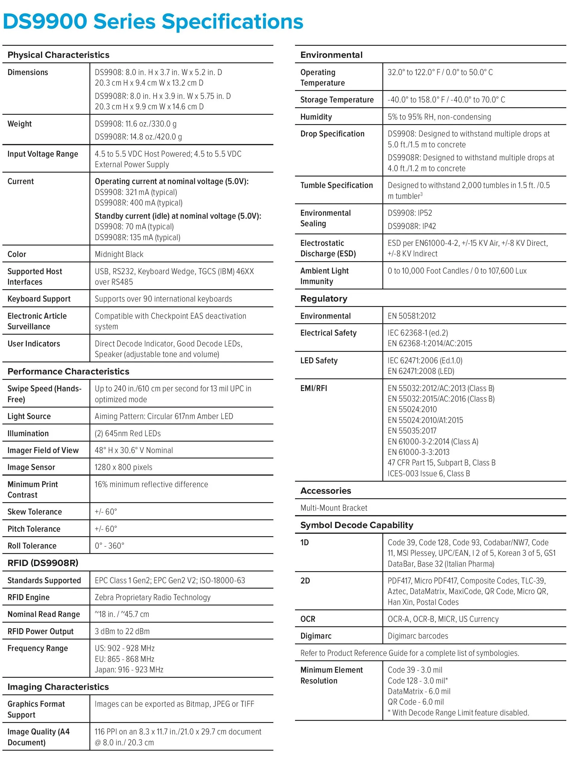 The imagers’ equipment includes an 800 MHz microprocessor and Zebra’s PRZM Intelligent Imaging Technology. Together they provide excellent performance when reading 1D, 2D and Digimarc barcodes. And all that regardless of their condition – digital barcodes on smartphones, poorly readable, crumpled, faded, shiny, damaged barcodes and those with a poor contrast are reliably captured. The reading rate is up to 610 cm/sec. in presentation mode. They are also robust: the DS9908 has an IP52 certification and is impact-resistant from a height of 1.5 m. The DS9908R is IP42-certified and withstands falls from 1.2 m height. The imagers have USB, RS-232, keyboard wedge and TGCS (IBM) 46XX over RS-485 interfaces.