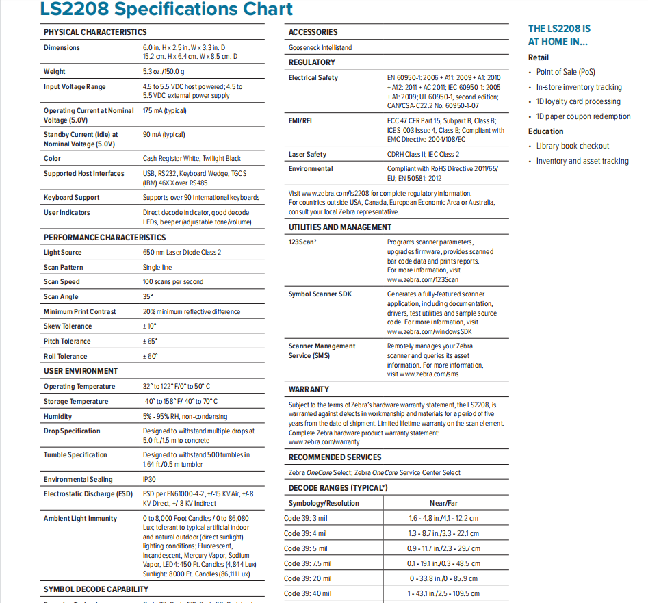 With its patented single board construction, patented frictionless liquid polymer scan element, scratch resistant tempered glass exit window and a stringent drop and tumble specification, the LS2208 delivers reliable all-day,every day operation.